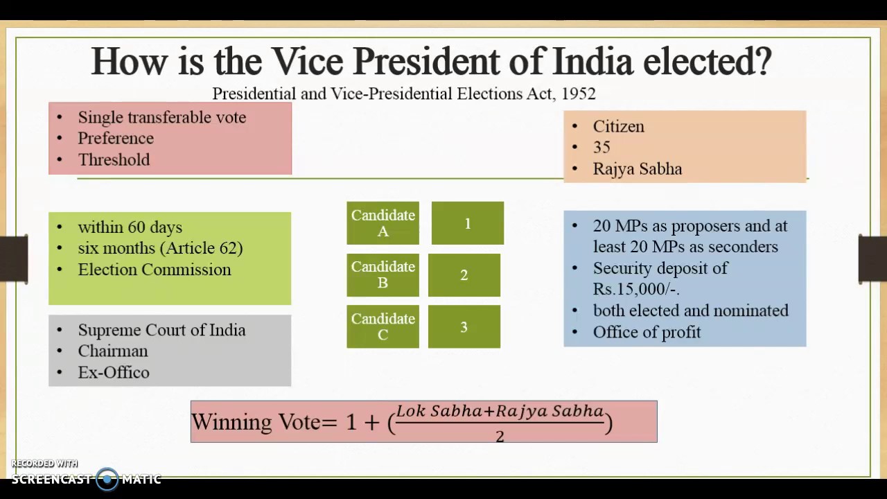 The Vice President is elected with the aid of using an electoral university wherein the participants of each of the Houses of Parliament vote for the second highest constitutional office in the country using the proportional representation system and a single transferable vote through a secret ballot.