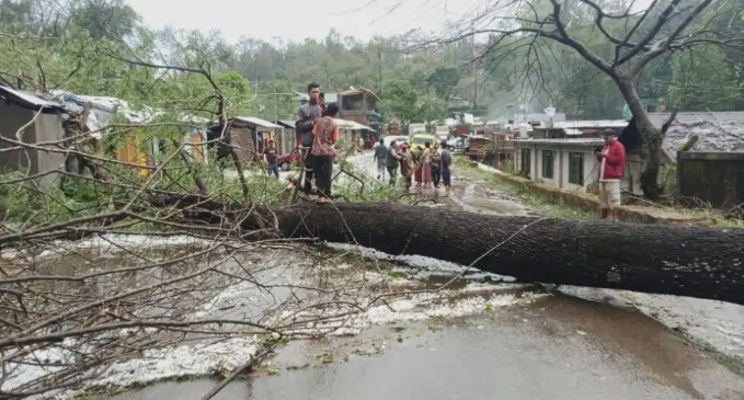 Shillong, April 14: On the outskirts of Meghalaya capital – Shillong, on Thursday afternoon, was battered by a hailstorm that resulted in trees being uprooted and properties damaged.