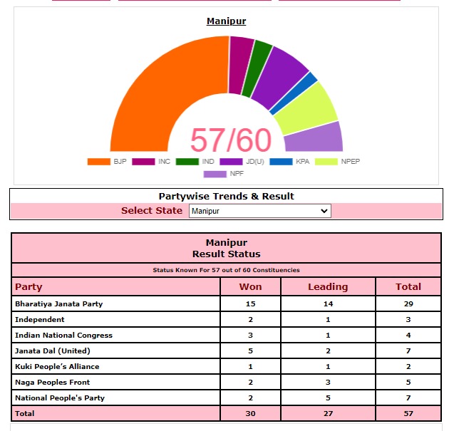- Official EC trends for Manipur Elections | BJP wins 15 seats & leads on 14, Congress wins 3 & leads on 1, Janata Dal (United) wins 5 & leads on 2.